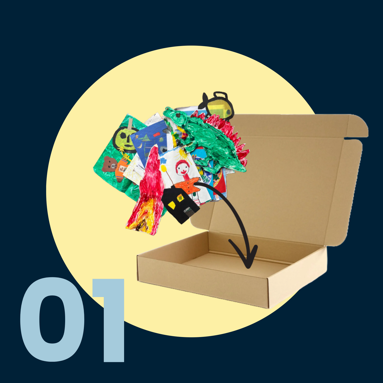 Einfach deine HappyHands Sammelbox bestellen und mit bis zu 100 Kinderkunstwerken füllen. Retourenetikett sowie alles weitere, was du für den Rückversand benötigst, liegt der Box bei. Viel Spaß beim Sammeln!